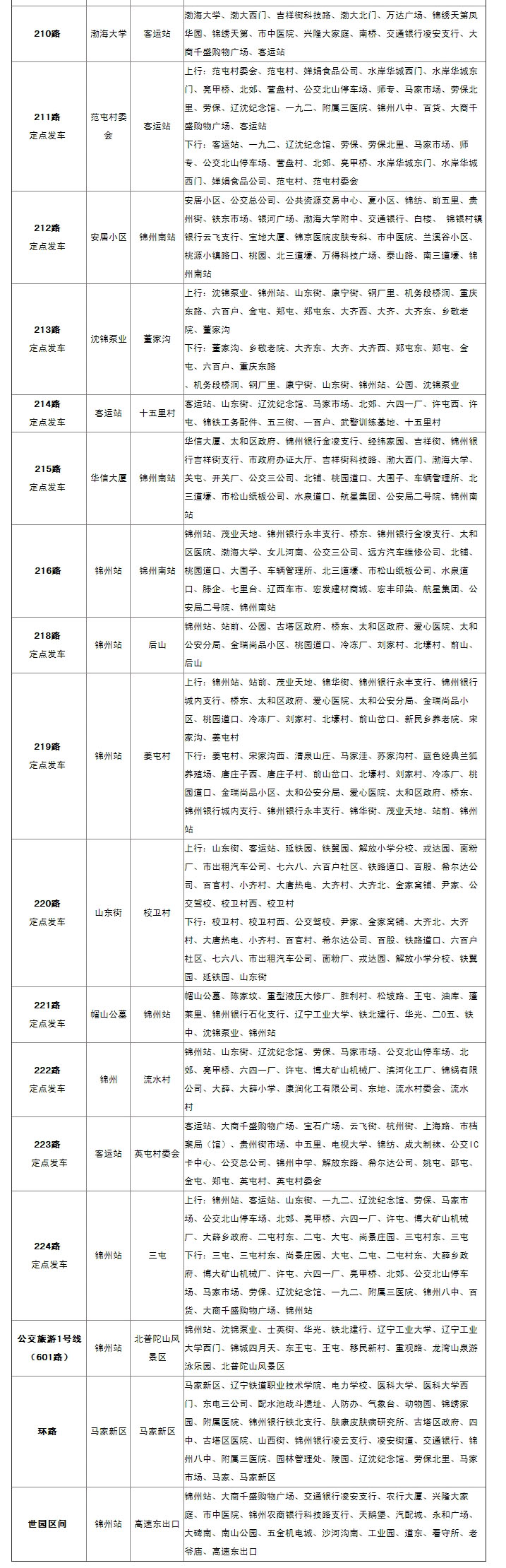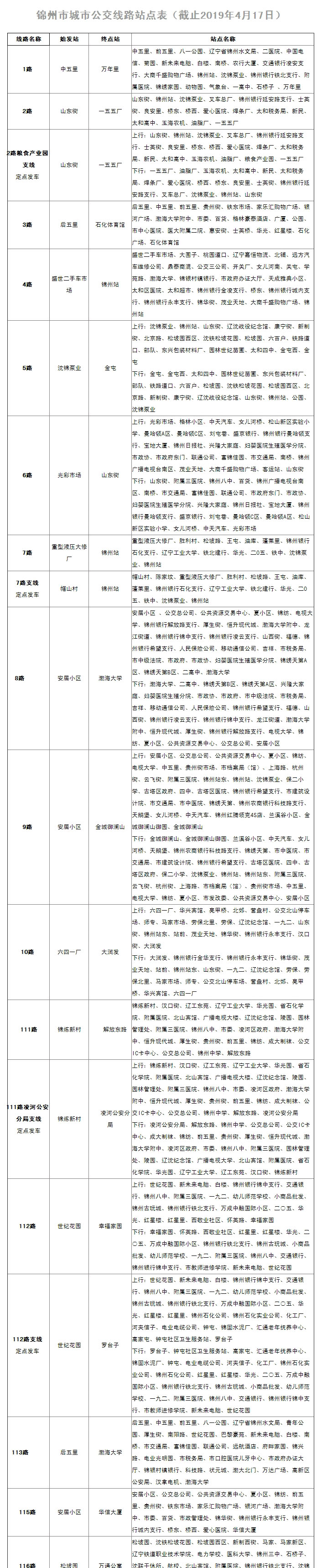 錦州市城市公交線路站點(diǎn)表(截止2019年4月17日)